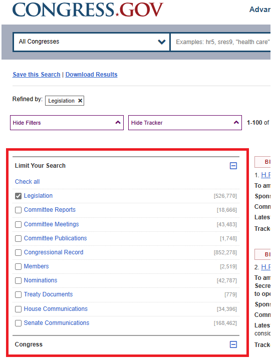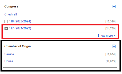 I choose the 117th Congress (red box) and the screen will update which Chambers of Origin contents (black box).