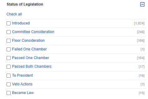 The STATUS will change (depending on the filters applied) and gives you a quick glance at what is present, but we haven’t yet chosen HOUSE or SENATE.