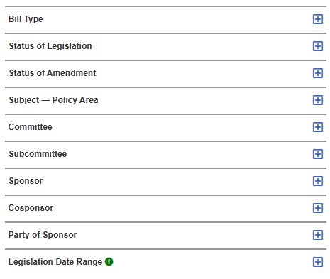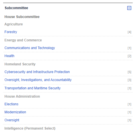 As you can see (above) there are more categories to drill through, to finite your search and tracking information. Since I am/have been tracking ALL of the veteran bills in ALL of the Congresses since the 93rd Congress, the VA Committee Bills in the 118th (current Congress) have already been tracked (and continue to be tracked) so I will choose a different Committee to show how to filter the tracking.