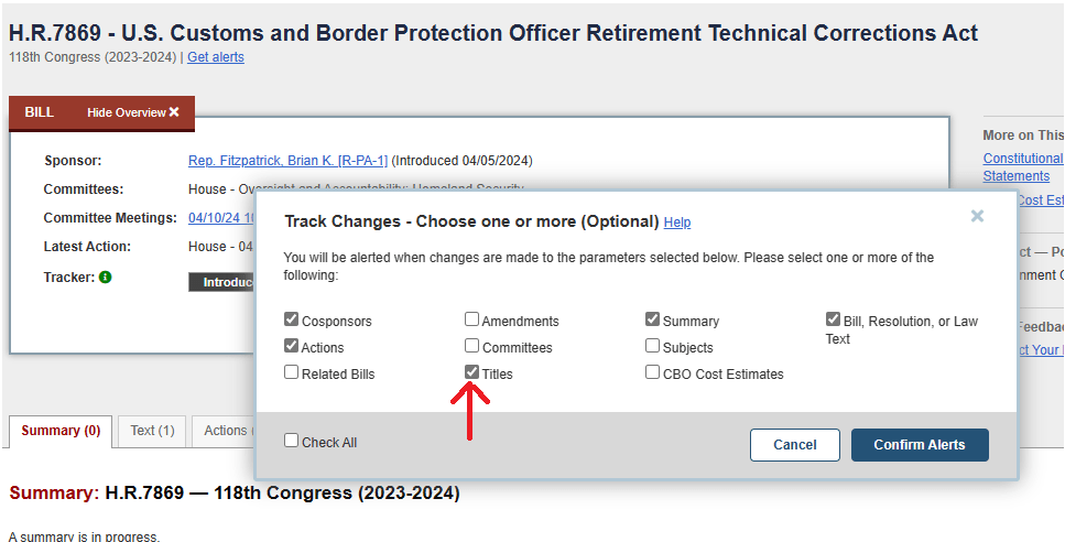 A window will open and you can choose what alerts/changes you want to receive a notification for. Some are already checked, I did not check these boxes. I want to TITLE changes to be included in the tracking. Once I check that box, I click CONFIRM ALERTS.