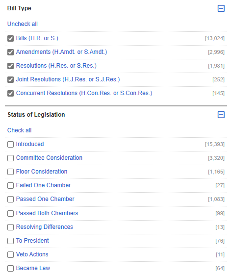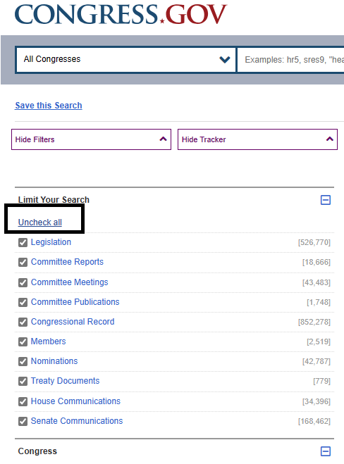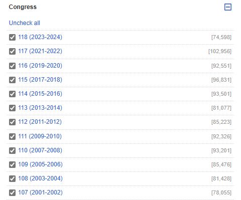 I do the same thing (above) for the specific Congress (I uncheck all, then I check the Congress I am looking into).