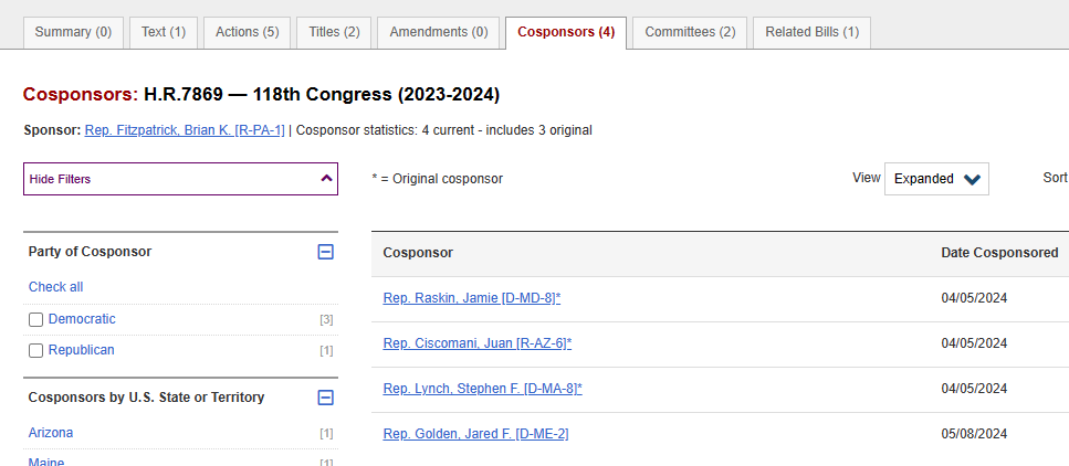 I can also look at (with my current filter criteria), party-specific information for sponsorship. This will show that of the 440 bills in this committee, 282 were GOP sponsored and 158 were Democrat sponsored.