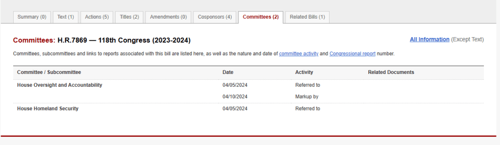 The tabs on each bill, provides further information when collecting data. These tabs: Summary; Text; Actions; Titles; Amedments; Cosponsors; Committees; and Related Bills, all show different information.