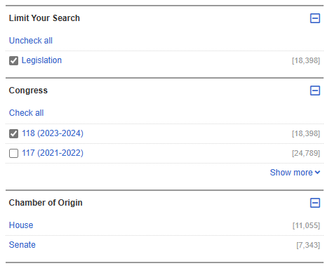 I unchecked the 117th because I won’t be able to show how to filter the data on each bill since we are in the 118th, but I kept the image of the 117th (two above) to show how we can toggle between any Congress. This is important because you can only track on ACTIVE Congress/Senate bills.