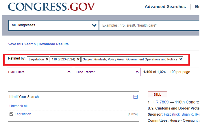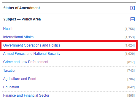 I will choose (above) Government Operations and Politics, which shows there are 1,024 bills in the 118th Congress thus far.